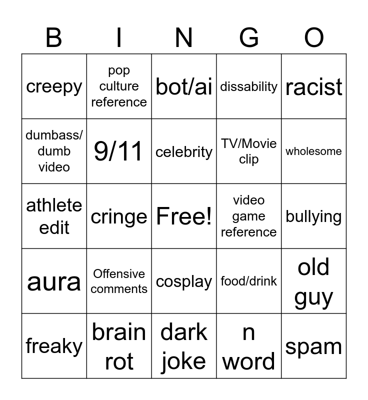 This bingo card has a free space and 24 words: Offensive comments, brain rot, celebrity, freaky, racist, creepy, dumbass/ dumb video, pop culture reference, video game reference, cosplay, TV/Movie clip, athlete edit, food/drink, old guy, 9/11, n word, bullying, bot/ai, wholesome, cringe, spam, aura, dissability and dark joke.