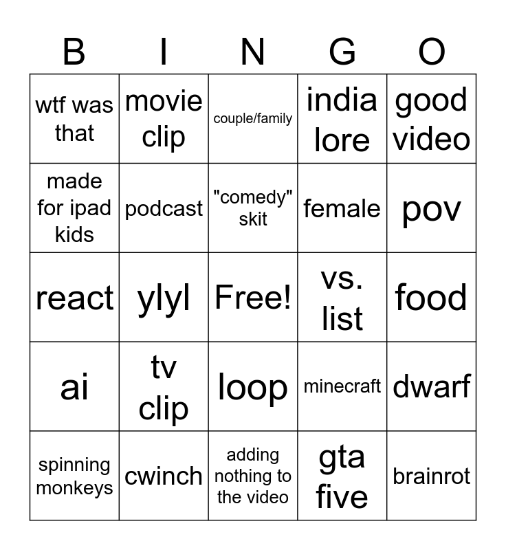 This bingo card has a free space and 24 words: tv clip, cwinch, "comedy" skit, spinning monkeys, good video, wtf was that, made for ipad kids, movie clip, vs. list, loop, female, react, minecraft, dwarf, podcast, gta five, food, couple/family, pov, ylyl, brainrot, ai, india lore and adding nothing to the video.