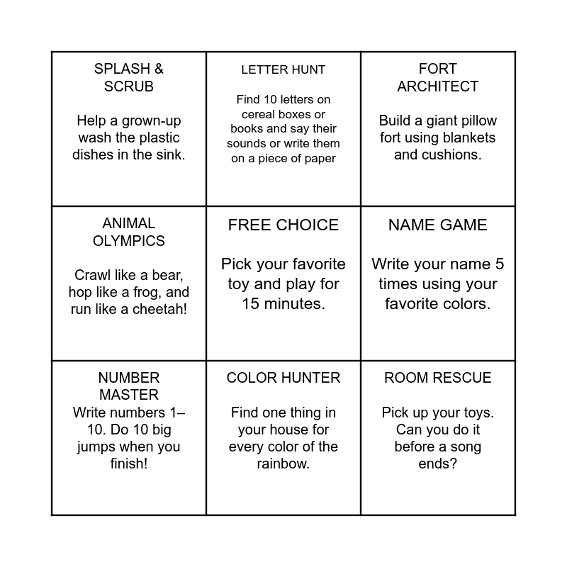 This bingo card has a free space and 8 words: NAME GAME Write your name 5 times using your favorite colors., FORT ARCHITECT Build a giant pillow fort using blankets and cushions., LETTER HUNT Find 10 letters on cereal boxes or books and say their sounds or write them on a piece of paper, NUMBER MASTER Write numbers 1–10. Do 10 big jumps when you finish!, SPLASH & SCRUB Help a grown-up wash the plastic dishes in the sink., ROOM RESCUE Pick up your toys. Can you do it before a song ends?, ANIMAL OLYMPICS Crawl like a bear, hop like a frog, and run like a cheetah! and COLOR HUNTER Find one thing in your house for every color of the rainbow..