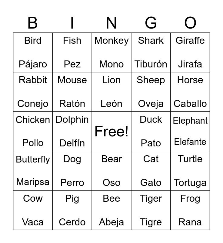 This bingo card has a free space and 24 words: Dog Perro, Pig Cerdo, Lion León, Cow Vaca, Giraffe Jirafa, Bird Pájaro, Rabbit Conejo, Fish Pez, Duck Pato, Bear Oso, Sheep Oveja, Chicken Pollo, Cat Gato, Turtle Tortuga, Mouse Ratón, Tiger Tigre, Elephant Elefante, Monkey Mono, Horse Caballo, Dolphin Delfín, Frog Rana, Butterfly Maripsa, Shark Tiburón and Bee Abeja.