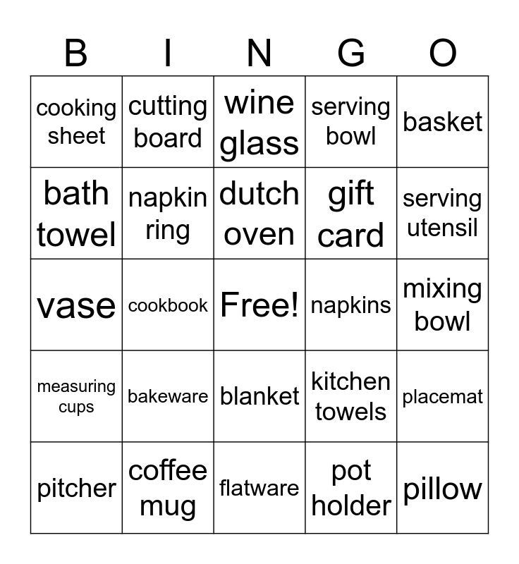 This bingo card has a free space and 27 words: kitchen towels, plate, gift card, flatware, bath towel, wine glass, cutting board, measuring cups, napkins, placemat, vase, serving bowl, pitcher, coffee mug, serving utensil, drinking glass, napkin ring, dutch oven, bakeware, cooking sheet, mixing bowl, pot holder, cookbook, pillow, blanket, basket and picture frame.