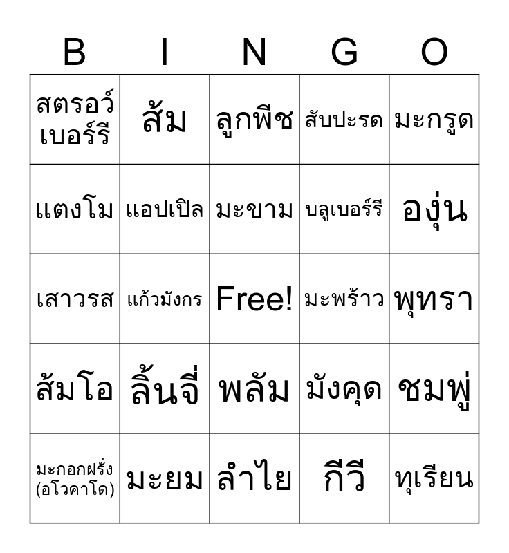 This bingo card has a free space and 50 words: มะม่วง, ทุเรียน, เงาะ, ลำไย, ลิ้นจี่, กล้วย, ส้ม, มะละกอ, แตงโม, ฝรั่ง, แอปเปิล, สับปะรด, ชมพู่, มังคุด, ขนุน, น้อยหน่า, มะขาม, มะพร้าว, มะนาว, มะกรูด, แก้วมังกร, กีวี, สตรอว์เบอร์รี, บลูเบอร์รี, ราสป์เบอร์รี, แบล็กเบอร์รี, องุ่น, ลูกแพร์, ลูกพีช, พลัม, เชอร์รี, ทับทิม, มะไฟ, มะเฟือง, มะยม, ลูกหม่อน (มัลเบอร์รี), สละ, ลองกอง, ระกำ, พุทรา, มะเดื่อ, แคนตาลูป, เมลอน, ลูกฟิก, มะกอกฝรั่ง (อโวคาโด), เสาวรส, ตะขบ, มะตูม, ส้มโอ and พุทธรักษา (ผลกินได้ในบางสายพันธุ์).