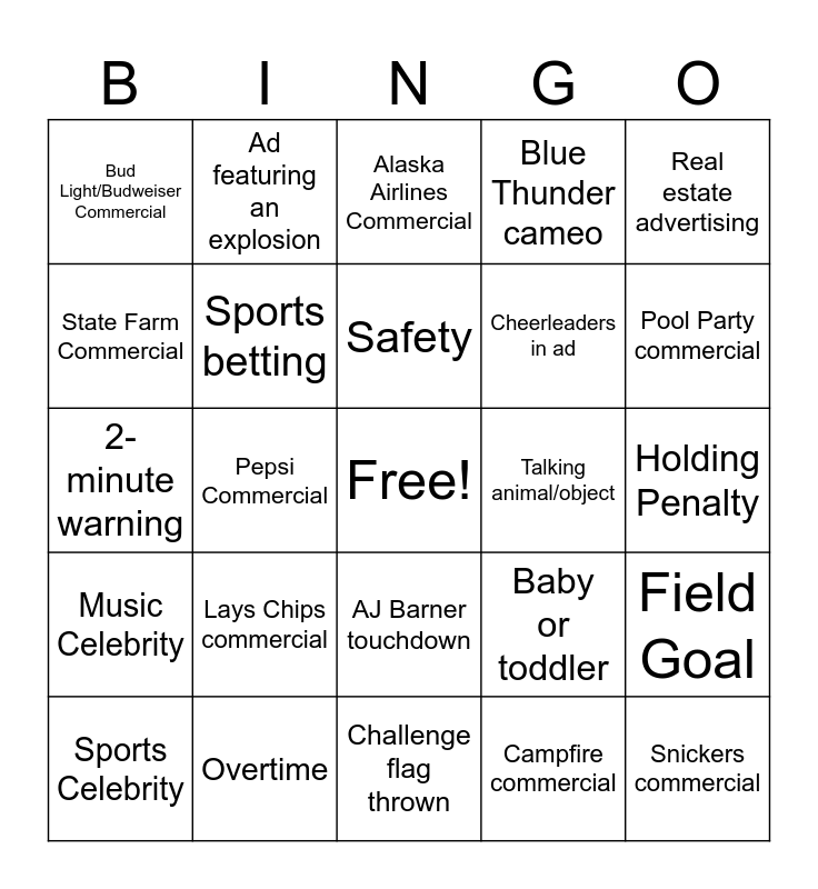 This bingo card has a free space and 89 words: Sam Darnold passing touchdown, Cooper Kupp touchdown, AJ Barner touchdown, Jaxon Smith-Njigba touchdown, Rasheed Shaheed touchdown, Interception, Pick 6, Fumble, Sack, Pass interference Penalty, False Start Penalty, Offsides Penalty, Field Goal, Holding Penalty, Extra Point, Safety, Kick Return touchdown, Punt Return Touchdown, Kenneth Walker III touchdown, Player hurdles a defender, Blocked field goal, Blocked punt, Challenge flag thrown, Team Timeout called, 2-minute warning, Overtime, End of quarter, Two-point conversion failed, Two-point conversion successful, Marshawn Lynch Commercial, Blue Thunder cameo, Pepsi Commercial, Doritos Commercial, Bud Light/Budweiser Commercial, Geico Commercial, Alaska Airlines Commercial, State Farm Commercial, Commercial with dog, Pool Party commercial, Sports Celebrity, Music Celebrity, Movie Trailer, Ad wit Singing/dancing, Throwback to a 90s/80s movie, Baby or toddler, Talking animal/object, An "everyday" person acting heroic, Car chase, Car driving on a mountain, Ad featuring an explosion, Slow-motion action, A commercial in black and white, An ad that doesn't show the product until the end, QR code on the screen, Streaming service ad, Crypto/Financial app ad, Fast food commercial, Cellphone carrier, TikTok ad, A retired NFL player, A famous athlete from another sport, Ryan Reynolds, Kevin Hart, A celebrity couple, Ad uses the phrase "The Big Game", Someone in the room explains the commercial, A commercial makes fun of the Super Bowl, A commercial highlights "limited edition", A commercial uses a popular meme, Lays Chips commercial, Snickers commercial, Danny Devito in Jimmy John’s, Commercial with a referee, Cheerleaders in ad, Sports betting, Campfire commercial, Beach volleyball commercial, Riding horses in ad, Cruise commercial, Ads featuring children’s cartoon characters, Real estate advertising, Bank or credit union, Military recruitment ad, Ads mentioning Tom Brady, Super Bowl flashback commercial, Manning brothers, Coin Toss, Good Year Blimp shot and Live flyover the stadium.