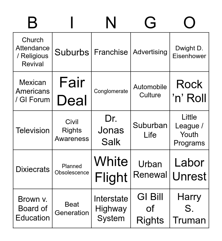 This bingo card has 34 words: Harry S. Truman, GI Bill of Rights, Levittown, Baby Boom, Dixiecrats, Fair Deal, Dwight D. Eisenhower, Brown v. Board of Education, Suburbs, Consumerism, Conglomerate, Franchise, William Levitt, Labor Strikes (1946), Suburban Life, Rock ānā Roll, Beat Generation, Television, Planned Obsolescence, Urban Renewal, White Flight, Michael Harrington, Church Attendance / Religious Revival, Little League / Youth Programs, Interstate Highway System, Dr. Jonas Salk, Advertising, Union Membership, Automobile Culture, Mexican Americans / GI Forum, Native Americans / Termination Policy, Civil Rights Awareness, Labor Unrest and Rosa Parks / Montgomery Bus Boycott.