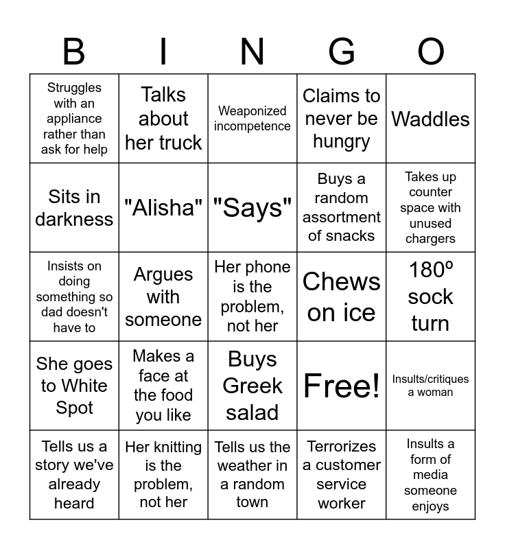 This bingo card has 25 words: Makes a face at the food you like, Tells us the weather in a random town, "Says", Tells us a story we've already heard, Waddles, Struggles with an appliance rather than ask for help, Sits in darkness, Talks about her truck, Chews on ice, Buys Greek salad, Buys a random assortment of snacks, Insists on doing something so dad doesn't have to, Free!, Insults/critiques a woman, "Alisha", Insults a form of media someone enjoys, 180º sock turn, Weaponized incompetence, Takes up counter space with unused chargers, Argues with someone, Her phone is the problem, not her, Her knitting is the problem, not her, She goes to White Spot, Claims to never be hungry and Terrorizes a customer service worker.