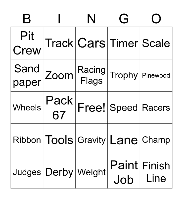 This bingo card has a free space and 24 words: Tools, Derby, Racing Flags, Judges, Scale, Pit Crew, Sand paper, Track, Speed, Gravity, Trophy, Wheels, Lane, Champ, Zoom, Paint Job, Racers, Cars, Pinewood, Pack 67, Finish Line, Ribbon, Timer and Weight.
