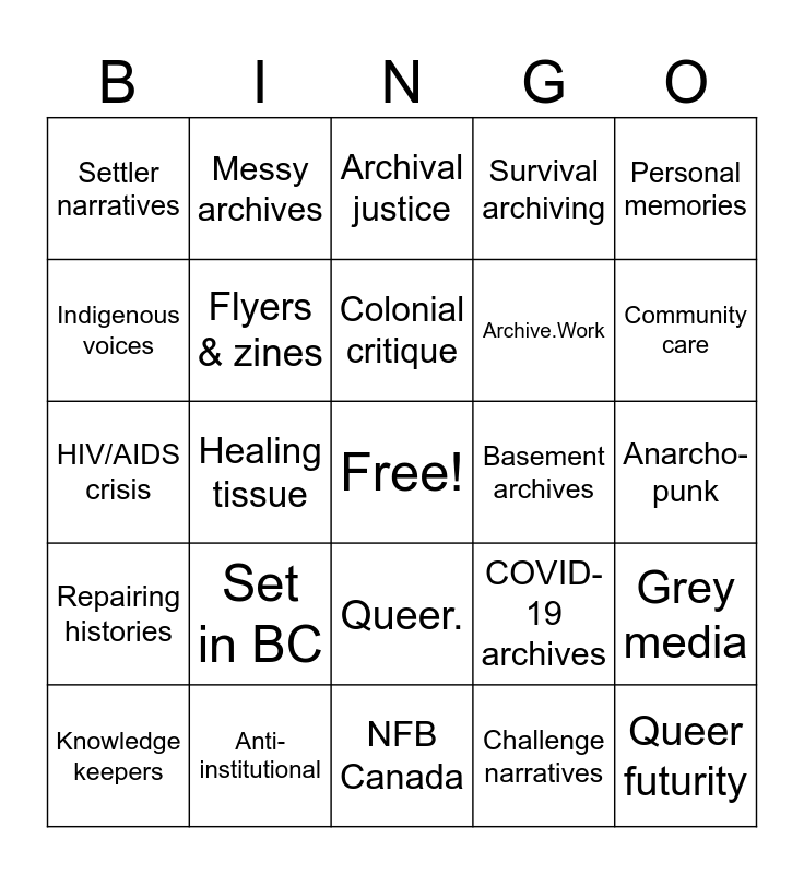 This bingo card has a free space and 25 words: Set in BC, NFB Canada, Colonial critique, Knowledge keepers, Personal memories, Settler narratives, Indigenous voices, Messy archives, Basement archives, Queer., Archive.Work, HIV/AIDS crisis, COVID-19 archives, Grey media, Flyers & zines, Non-cooperative, Anarcho-punk, Archival justice, Community care, Healing tissue, Queer futurity, Anti-institutional, Repairing histories, Survival archiving and Challenge narratives.