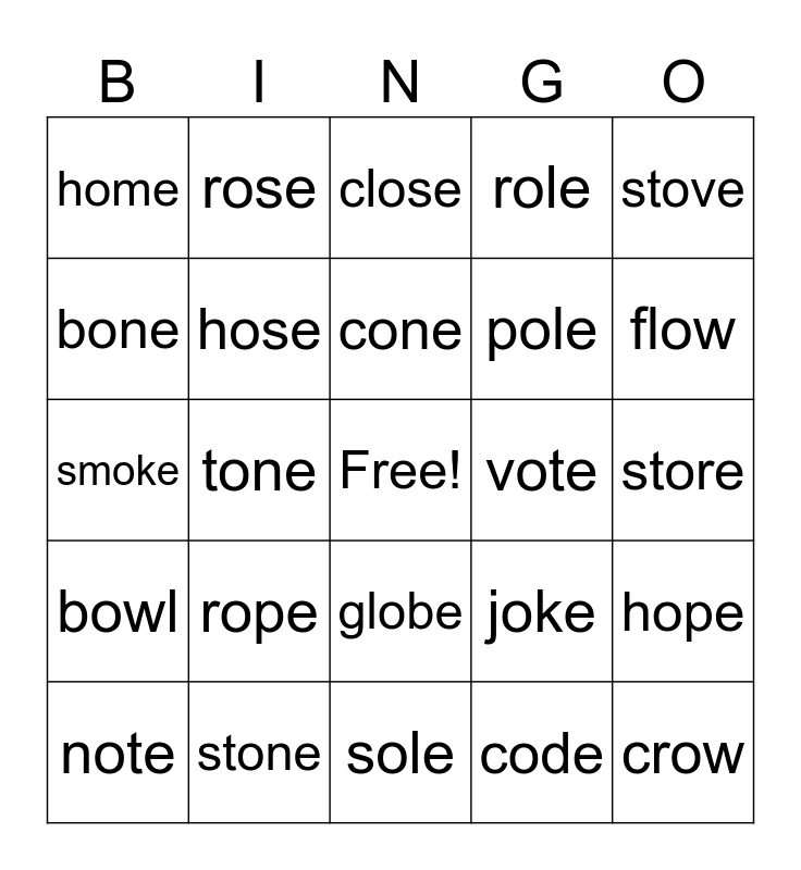 This bingo card has a free space and 24 words: rope, stone, cone, note, stove, home, bone, rose, vote, globe, pole, smoke, joke, hope, hose, code, store, close, flow, tone, crow, bowl, role and sole.