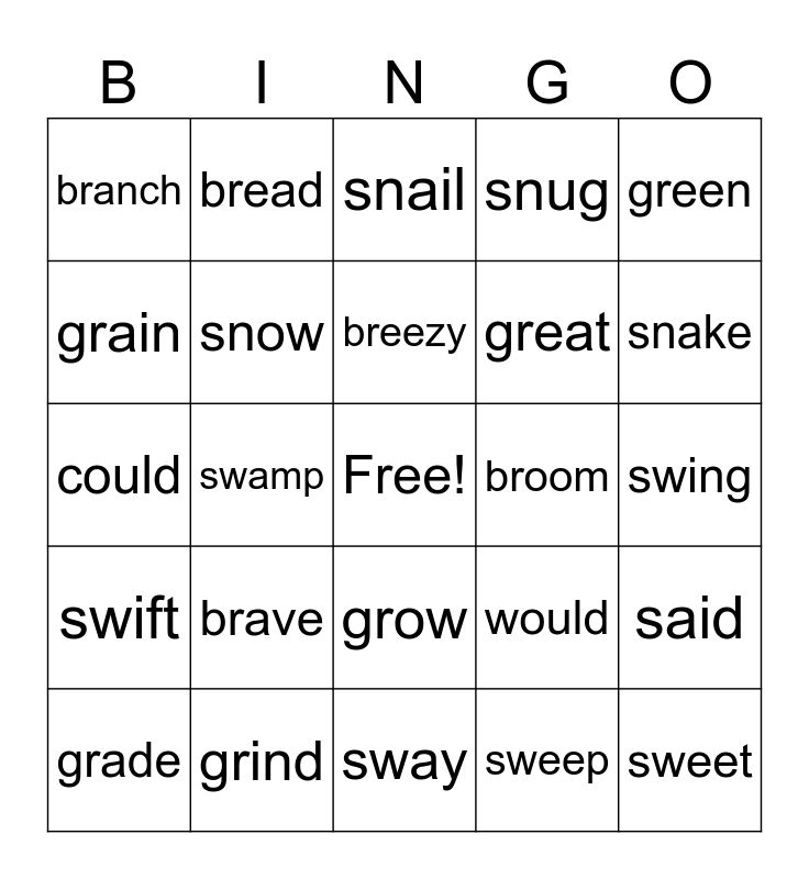 This bingo card has a free space and 24 words: brave, grind, breezy, grade, green, branch, grain, bread, broom, grow, great, could, would, said, snow, sweep, swing, snail, snake, swamp, sweet, swift, snug and sway.