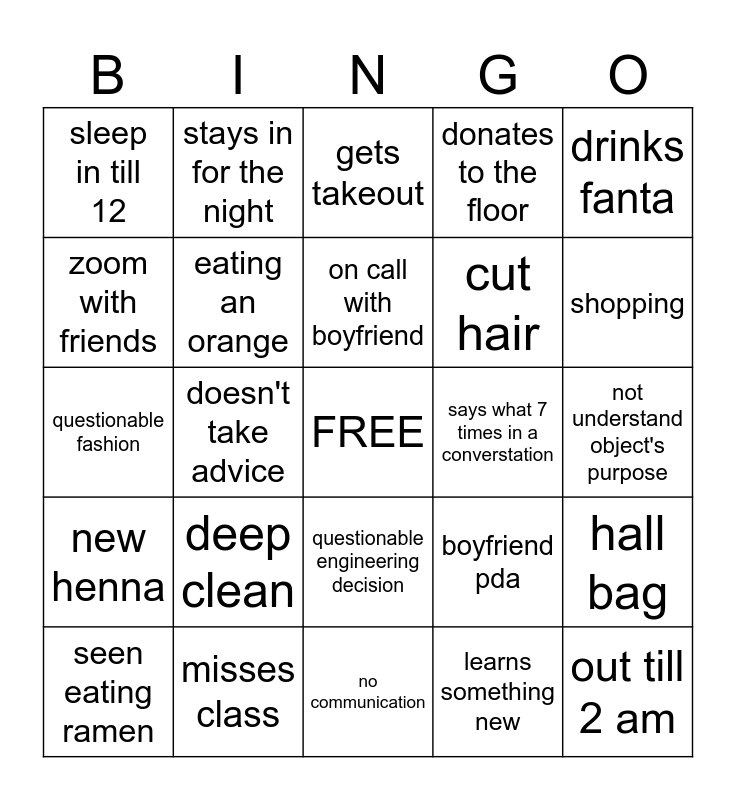 This bingo card has a free space and 24 words: seen eating ramen, deep clean, on call with boyfriend, learns something new, drinks fanta, sleep in till 12, stays in for the night, gets takeout, says what 7 times in a converstation, not understand object's purpose, questionable fashion, eating an orange, boyfriend pda, hall bag, zoom with friends, misses class, no communication, donates to the floor, shopping, new henna, doesn't take advice, questionable engineering decision, cut hair and out till 2 am.