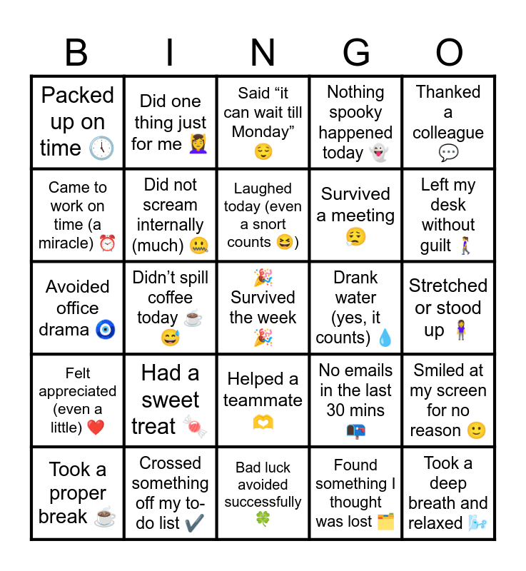 This bingo card has a free space and 24 words: Had a sweet treat 🍬, Crossed something off my to-do list ✔️, Laughed today (even a snort counts 😆), Took a proper break ☕, Thanked a colleague 💬, Packed up on time 🕔, Came to work on time (a miracle) ⏰, Did one thing just for me 💆♀️, Drank water (yes, it counts) 💧, Helped a teammate 🫶, Survived a meeting 😮💨, Avoided office drama 🧿, No emails in the last 30 mins 📭, Smiled at my screen for no reason 🙂, Did not scream internally (much) 🤐, Found something I thought was lost 🗂️, Stretched or stood up 🧍♀️, Said “it can wait till Monday” 😌, Left my desk without guilt 🚶♀️, Didn’t spill coffee today ☕😅, Took a deep breath and relaxed 🌬️, Felt appreciated (even a little) ❤️, Nothing spooky happened today 👻 and Bad luck avoided successfully 🍀.