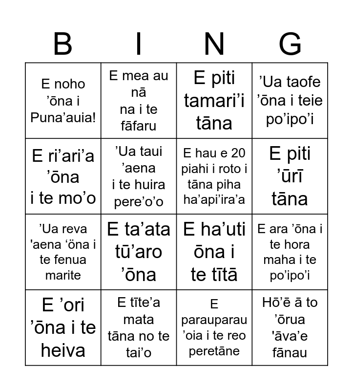 This bingo card has 16 words: E ’ori ’ōna i te heiva, E tīte’a mata tāna no te tai’o, E piti tamari’i tāna, ’Ua taofe ’ōna i teie po’ipo’i, E ri’ari’a ’ōna i te mo’o, E mea au nā na i te fāfaru, E ha’uti ōna i te tītā, E ara ’ōna i te hora maha i te po’ipo’i, E noho ’ōna i Puna’auia!, ’Ua taui ’aena i te huira pere’o’o, E parauparau ’oia i te reo peretāne, E piti ’ūrī tāna, ’Ua reva 'aena ‘öna i te fenua marite, E ta’ata tū’aro ’ōna, E hau e 20 piahi i roto i tāna piha ha’api’ira’a and Hō’ē ā to ’ōrua 'āva’e fānau.