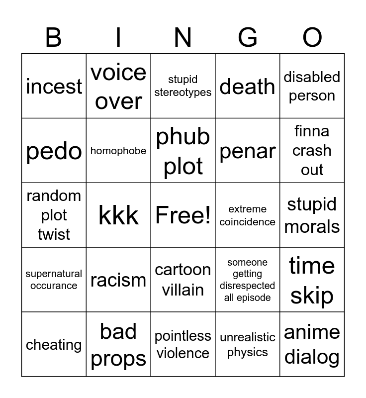 This bingo card has a free space and 24 words: racism, bad props, phub plot, cheating, disabled person, incest, pedo, voice over, extreme coincidence, cartoon villain, penar, random plot twist, someone getting disrespected all episode, time skip, homophobe, unrealistic physics, stupid morals, stupid stereotypes, finna crash out, kkk, anime dialog, supernatural occurance, death and pointless violence.