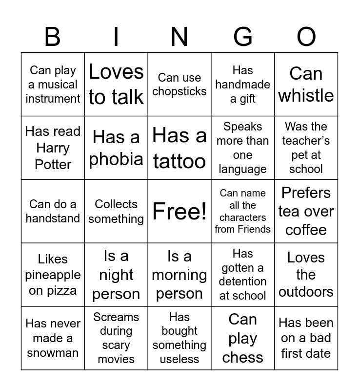 This bingo card has a free space and 40 words: Is a parent, Can do a handstand, Loves to cook or bake, Has a phobia, Screams during scary movies, Is a morning person, Has a tattoo, Has had stitches, Can whistle, Likes pineapple on pizza, Collects something, Has handmade a gift, Has been on a bad first date, Prefers tea over coffee, Can name all the characters from Friends, Is a night person, Prefers savoury over sweet, Can play a musical instrument, Has laughed so hard they cried, Can use chopsticks, Loves the outdoors, Can play chess, Speaks more than one language, Has read Harry Potter, Has never seen a Star Wars movie, Has zero unread emails, Is allergic to something, Is a neat freak, Kills houseplants, Can touch their toes, You can beat them at rock, paper, scissors, Has never made a snowman, Has never been on a boat, Has gotten a detention at school, Was the teacher’s pet at school, Has bought something useless, Is always late, Daydreams, Loves to talk and Prefers winter over summer.