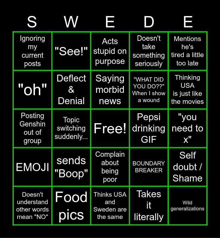 This bingo card has a free space and 40 words: Unrelated Meme, Posting Genshin out of group, Ignoring my previous posts, Deflect & Denial, Food pics, Complain about being poor, Saying morbid news, :D / xD, Mentions he's tired a little too late, EMOJI, Topic switching suddenly..., Doesn't take something seriously, Wild generalizations, "you need to x", Pepsi drinking GIF, sends "Boop", suggests youtuber / game I already know, Ignoring my current posts, Misunderstands / doesn't get how something works, Acts stupid on purpose, Self doubt / Shame, Takes it literally, "WHAT DID YOU DO??" When I show a wound, "oh", "uh oh", Sending something completely in Swedish, ".......", Mentions Pepsi at all, Special Interests (dinosaurs, space), Assumes I eat/drink the same things as him, "its snowing here, is it for you?", Doesn't understand other words mean "NO", Continues to explain after I already said no, BOUNDARY BREAKER, Thinking USA is just like the movies, Thinks USA and Sweden are the same, :|, (Reads but doesnt reply), "See!" and Spinning his own narrative.