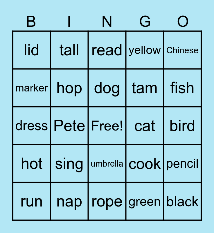 This bingo card has a free space and 24 words: sing, nap, dog, run, Chinese, lid, marker, tall, cat, umbrella, tam, dress, cook, pencil, hop, green, bird, read, fish, Pete, black, hot, yellow and rope.