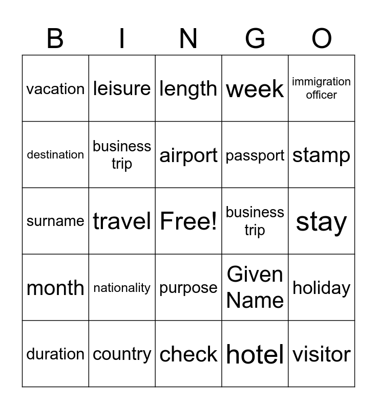 This bingo card has a free space and 24 words: nationality, country, airport, duration, immigration officer, vacation, destination, leisure, business trip, purpose, passport, surname, Given Name, holiday, business trip, hotel, stay, length, stamp, travel, visitor, month, week and check.