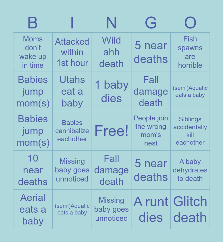 This bingo card has a free space and 53 words: (semi)Aquatic eats a baby, Glitch death, Parent accidentally kills baby, A runt dies, Missing baby goes unnoticed, Siblings accidentally kill eachother, Attacked within 1st hour, Critter eats a baby, Babies jump mom(s), Baby gets trampled, Utahs eat a baby, Wild ahh death, A baby dehydrates to death, 5 near deaths, 10 near deaths, Aerial eats a baby, 1 baby dies, People join the wrong mom's nest, 5 babies die, Fish spawns are horrible, Babies cannibalize eachother, A mom dies, Fall damage death, Moms don’t wake up in time, A baby starves to death, (semi)Aquatic eats a baby, (semi)Aquatic eats a baby, (semi)Aquatic eats a baby, (semi)Aquatic eats a baby, (semi)Aquatic eats a baby, Parent accidentally kills baby, Baby gets trampled, Moms don’t wake up in time, 1 baby dies, Fish spawns are horrible, Utahs eat a baby, 5 near deaths, Missing baby goes unnoticed, Wild ahh death, Attacked within 1st hour, A mom dies, People join the wrong mom's nest, Siblings accidentally kill eachother, Critter eats a baby, 5 babies die, Fall damage death, Aerial eats a baby, A baby starves to death, Babies jump mom(s), 10 near deaths, Glitch death, Babies cannibalize eachother and A baby dehydrates to death.
