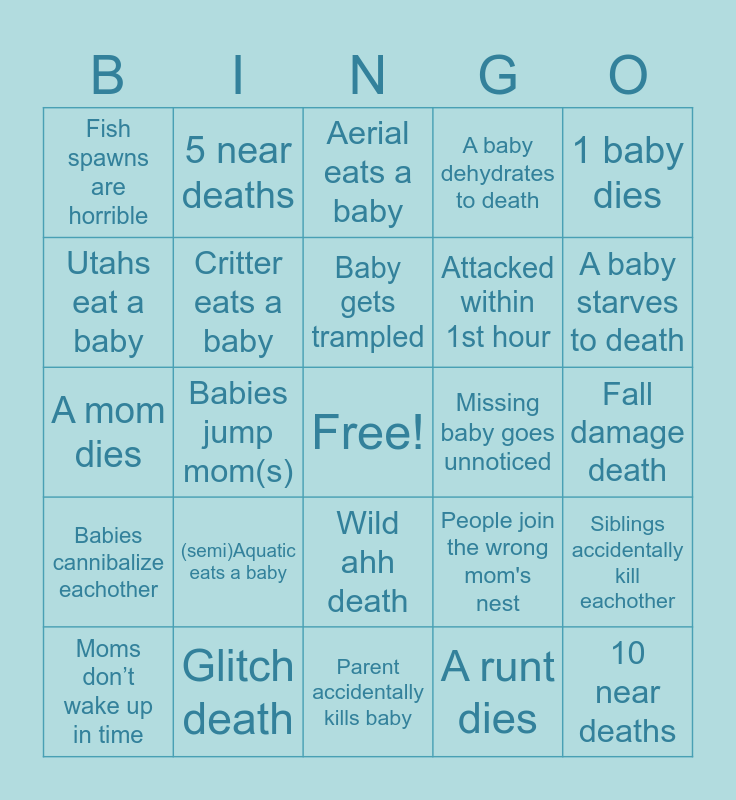 This bingo card has a free space and 25 words: (semi)Aquatic eats a baby, Parent accidentally kills baby, Baby gets trampled, Moms don’t wake up in time, 1 baby dies, Fish spawns are horrible, Utahs eat a baby, 5 near deaths, Missing baby goes unnoticed, Wild ahh death, Attacked within 1st hour, A mom dies, People join the wrong mom's nest, Siblings accidentally kill eachother, Critter eats a baby, 5 babies die, Fall damage death, Aerial eats a baby, A baby starves to death, Babies jump mom(s), 10 near deaths, Glitch death, Babies cannibalize eachother, A baby dehydrates to death and A runt dies.