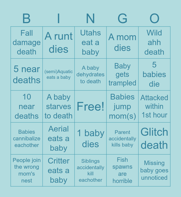 This bingo card has a free space and 25 words: Aerial eats a baby, Siblings accidentally kill eachother, A baby dehydrates to death, People join the wrong mom's nest, Wild ahh death, Fall damage death, 5 near deaths, A runt dies, Babies jump mom(s), 1 baby dies, Baby gets trampled, 10 near deaths, Parent accidentally kills baby, Glitch death, (semi)Aquatic eats a baby, Moms don’t wake up in time, Attacked within 1st hour, Utahs eat a baby, 5 babies die, A baby starves to death, Missing baby goes unnoticed, Critter eats a baby, Babies cannibalize eachother, A mom dies and Fish spawns are horrible.
