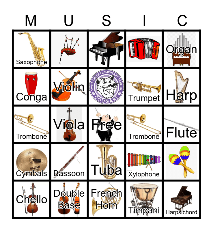 This bingo card has 29 images, a free space and 23 words: Chello, Guitar, Viola, Snare Drum, Saxophone, Violin, Bassoon, Trombone, Double Base, Flute, Harpsichord, French Horn, Timpani, Harp, Clarinet, Tuba, Cymbals, Organ, Trombone, Xylophone, Sitar, Trumpet and Conga.