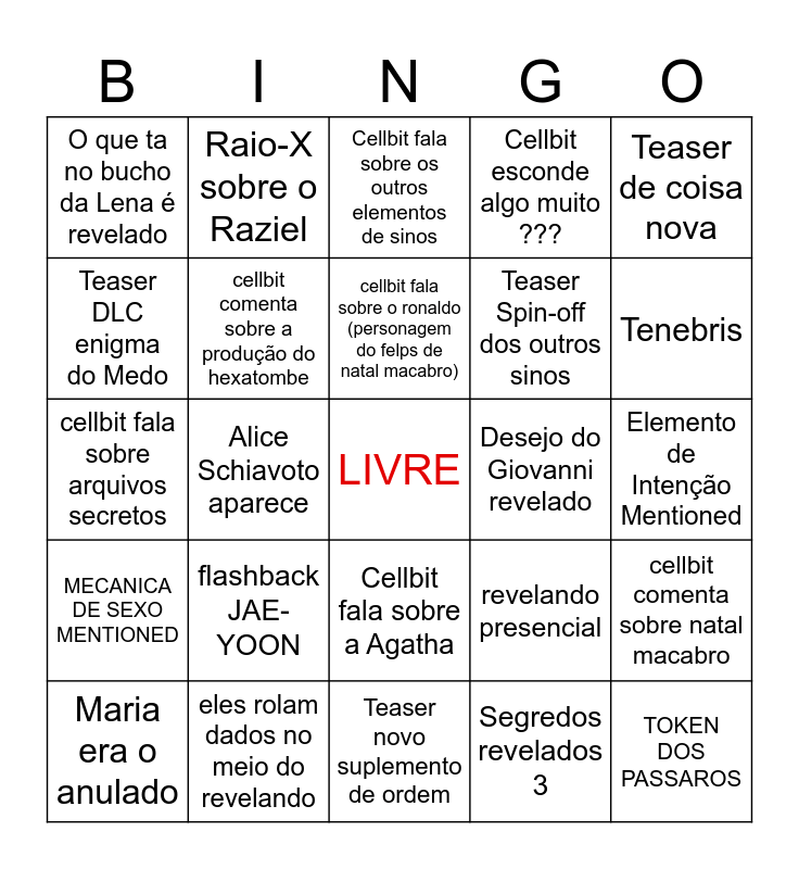 This bingo card has a free space and 24 words: flashback JAE-YOON, eles rolam dados no meio do revelando, cellbit fala sobre o ronaldo (personagem do felps de natal macabro), Maria era o anulado, Teaser de coisa nova, O que ta no bucho da Lena é revelado, Teaser DLC enigma do Medo, Raio-X sobre o Raziel, Desejo do Giovanni revelado, Cellbit fala sobre a Agatha, Teaser Spin-off dos outros sinos, cellbit fala sobre arquivos secretos, revelando presencial, cellbit comenta sobre natal macabro, cellbit comenta sobre a produção do hexatombe, Segredos revelados 3, Elemento de Intenção Mentioned, Cellbit fala sobre os outros elementos de sinos, Tenebris, Alice Schiavoto aparece, TOKEN DOS PASSAROS, MECANICA DE SEXO MENTIONED, Cellbit esconde algo muito ??? and Teaser novo suplemento de ordem.