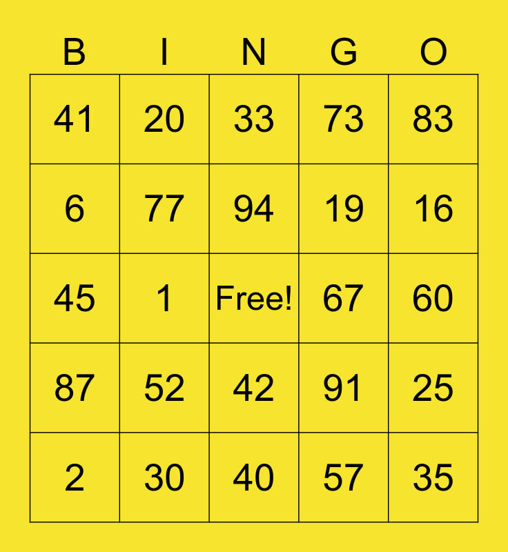 This bingo card has a free space and 24 words: 52, 30, 94, 2, 83, 41, 6, 20, 67, 42, 19, 45, 91, 25, 77, 57, 60, 33, 16, 1, 35, 87, 73 and 40.