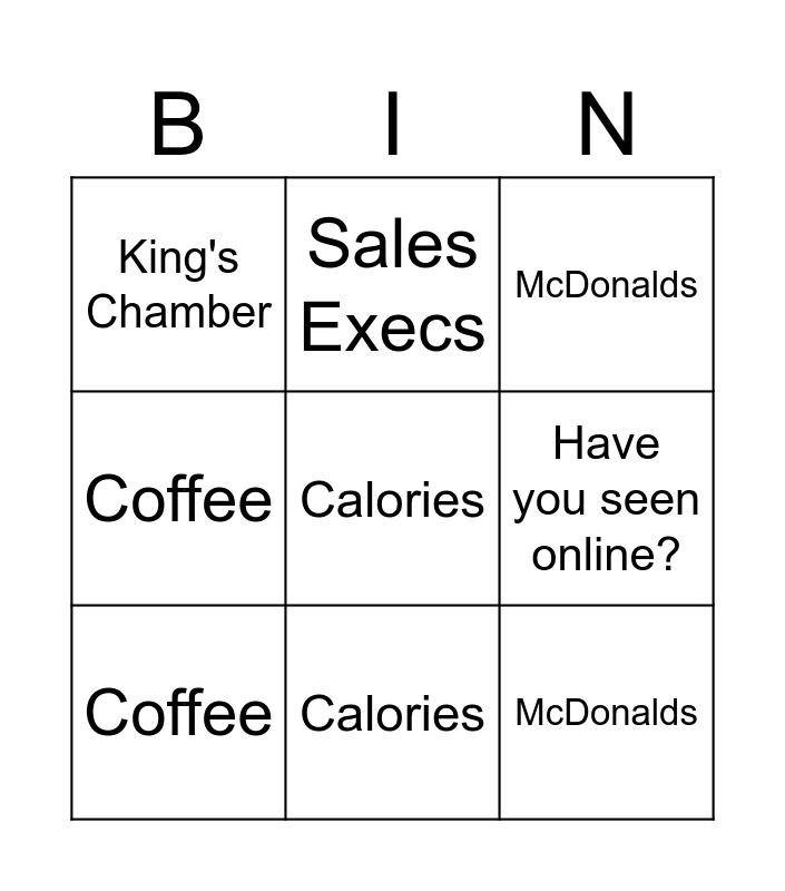 This bingo card has 18 words: Coffee, Motorbikes, McDonalds, King's Chamber, Calories, Have you seen online?, KOS, Sales Execs, Temperature, Coffee, Motorbikes, McDonalds, King's Chamber, Calories, Have you seen online?, KOS, Sales Execs and Temperature.
