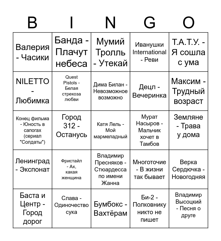 This bingo card has a free space and 99 words: Мираж - Музыка нас связала, Песня из к/ф "Кавказская пленница" - Песня о медаедях, Мурат Насыров - Я это ты, ты это я, Мумий Тролль - Утекай, Серёга - Чёрный бумер, REFLEX - Падали звёзды, Блестящие - Восточная сказка, Верка Сердючка - Хорошо, София Ротару - Червона рута, Андрей Губин - Зима холода, Дискотека Авария - Новогодняя, Ёлка - Прованс, Потап и Настя - Чумачечая весна, Владимир Пресняков - Стюардесса по имени Жанна, Андрей Губин - Девушки как звёзды, Валерия - Часики, Банда - Плачут небеса, Demo - Солнышко, Максим - Знаешь ли ты, Шура - Ты не верь слезам, Дима Билан - На берегу неба, Жанна Фриске - Ла Ла Ла, Алла Пугачёва - Этот мир, INSTASAMKA - За деньги да, Леонид Агутин - Хоп Хей Ла Ла Лей, Верка Сердючка - Новогодняя, Дима Билан - Невозможное возможно, Feduk & Элджей - Розовое вино, Ласковый май - Белые розы, Бумбокс - Хоттабыч, Бумбокс - Вахтёрам, Би-2 - Полковнику никто не пишет, Ласковый май - Розовый вечер, Песня из м/ ф "Чебурашка" - Голубой вагон, Город 312 - Останусь, Конец фильма - Юность в сапогах (сериал "Солдаты"), Игорь Николаев - Выпьем за любовь, Фактор 2 - Красавица, Глюкоза - Невеста, Фристайл - Ах, какая женщина, Отпетые мошенники - А у реки, Максим - Трудный возраст, Иванушки International - Реви, Слава - Одиночество сука, Тутси - Самый самый, Cream Soda - Плачу на техно, Верка Сердючка - Я не поняла, Сектор Газа - Лирика, Кино - Группа крови, DJ Дождик - Почему же, Slava Marlow - Снова я напиваюсь, Владимир Высоцкий - Песня о друге, Многоточие - В жизни так бывает, Hi-Fi - Седьмой лепесток, Грибы - Тает лёд, Руки вверх - 18 мне уже, Непара - Плачь и смотри, Вирус - Ты меня не ищи, На-На - Фаина, Т.А.Т.У. - Нас не догонят, Иракли - Лондон- Париж, Градусы - Режиссёр, ANNA ASTI - Царица, Алла Пугачёва - Позови меня с собой, Валерий Меладзе - Салют, Вера!, Т.А.Т.У. - Я сошла с ума, Комбинация - American Boy, Корни - Ты узнаешь её, ВИА Гра - Попытка номер 5, Ленинград - Экспонат, Краски - Он не знает ничего, Децл - Вечеринка, NILETTO - Любимка, Земфира - Искала, Скриптонит - Положение, Время и стекло - Имя 505, Quest Pistols - Белая стрекоза любви, Алена Свиридова - Розовый Фламинго, Пьер Нарцисс - Шоколадный заяц, Лигалайз - Будущие мамы, Мурат Насыров - Мальчик хочет в Тамбов, Рок- Острова - Ничего не говори, Валерий Леонтьев - Кончайте, девочки, Песня из м/ ф Чебурашка - Пусть бегут неуклюже, Михаил Круг - Владимирский централ, Total - Бьёт по глазам, Иванушки International - Тополиный пух, Банд'Эрос - Коламбия пикчерз не представляет, Земляне - Трава у дома, Баста и Центр - Город дорог, Натали - Ветер с моря дул, NILETTO & Rauf & Faik - Если тебе будет грустно, Тимати - В клубе, Филипп Киркоров - Просто подари, Hi Fi - не дано, Юлия Савичева - Привет, Т.А.Т.У. - Мальчик гей, Руки Вверх - Крошка моя and Гости из будущего - Беги от меня.