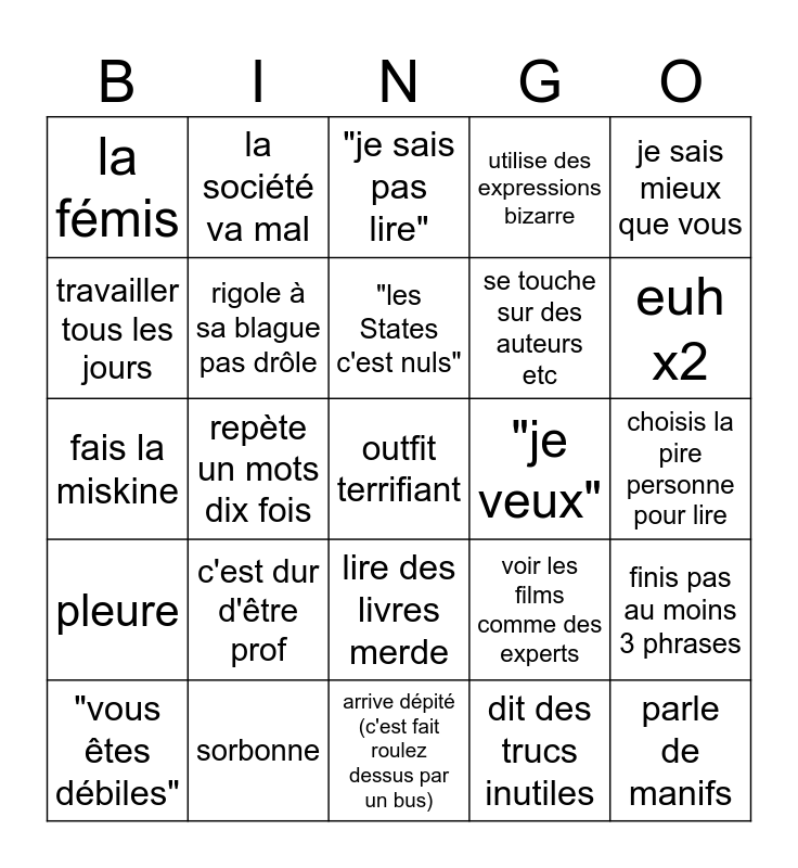 This bingo card has a free space and 24 words: c'est dur d'être prof, sorbonne, "les States c'est nuls", "vous êtes débiles", je sais mieux que vous, la fémis, travailler tous les jours, la société va mal, "je veux", lire des livres merde, se touche sur des auteurs etc, fais la miskine, voir les films comme des experts, finis pas au moins 3 phrases, rigole à sa blague pas drôle, dit des trucs inutiles, choisis la pire personne pour lire, "je sais pas lire", euh x2, repète un mots dix fois, parle de manifs, pleure, utilise des expressions bizarre and arrive dépité (c'est fait roulez dessus par un bus).