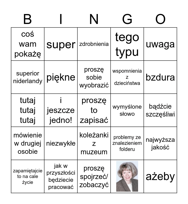This bingo card has 1 images and 24 words: niezwykłe, proszę spojrzeć/ zobaczyć, proszę sobie wyobrazić, zapamiętajcie to na cale życie, uwaga, coś wam pokażę, superior niderlandy, super, wymyślone słowo, koleżanki z muzeum, wspomnienia z dzieciństwa, tutaj tutaj tutaj, problemy ze znalezieniem folderu, najwyższa jakość, piękne, ażeby, bądźcie szczęśliwi, zdrobnienia, bzdura, i jeszcze jedno!, proszę to zapisać, jak w przyszłości będziecie pracować, mówienie w drugiej osobie and tego typu.