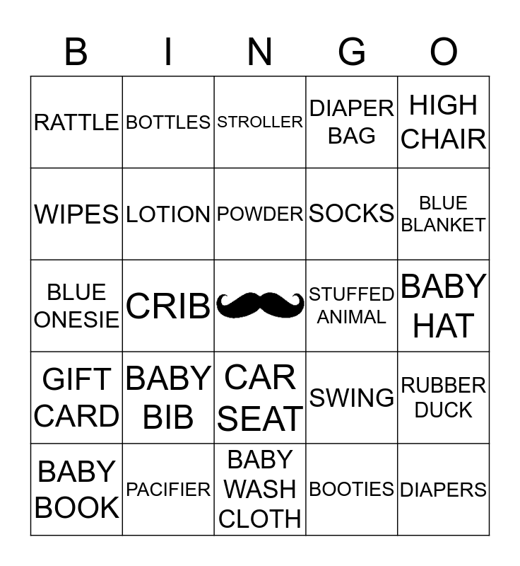 This bingo card has a free space and 24 words: BABY BIB, PACIFIER, POWDER, BABY BOOK, HIGH CHAIR, RATTLE, WIPES, BOTTLES, STUFFED ANIMAL, CAR SEAT, SOCKS, BLUE ONESIE, SWING, RUBBER DUCK, LOTION, BOOTIES, BABY HAT, STROLLER, BLUE BLANKET, CRIB, DIAPERS, GIFT CARD, DIAPER BAG and BABY WASH CLOTH.