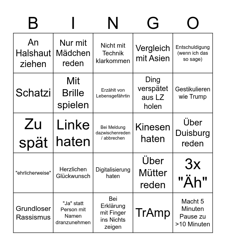 This bingo card has a free space and 24 words: Herzlichen Glückwunsch, "Ja" statt Person mit Namen dranzunehmen, Erzählt von Lebensgefährtin, Grundloser Rassismus, Entschuldigung (wenn ich das so sage), An Halshaut ziehen, Schatzi, Nur mit Mädchen reden, Kinesen haten, Digitalisierung haten, Ding verspätet aus LZ holen, Zu spät, Über Mütter reden, 3x "Äh", Mit Brille spielen, TrAmp, Über Duisburg reden, Nicht mit Technik klarkommen, Gestikulieren wie Trump, Linke haten, Macht 5 Minuten Pause zu >10 Minuten, "ehrlicherweise", Vergleich mit Asien and Bei Erklärung mit Finger ins Nichts zeigen.