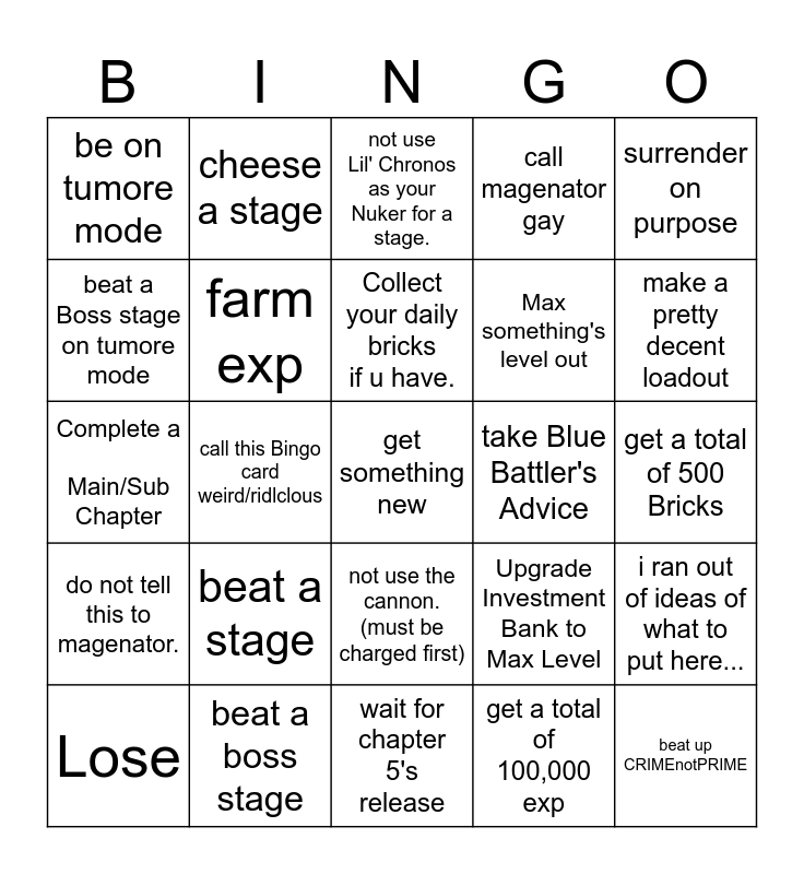 This bingo card has a free space and 24 words: beat a stage, beat a boss stage, Collect your daily bricks if u have., Lose, surrender on purpose, be on tumore mode, beat a Boss stage on tumore mode, cheese a stage, take Blue Battler's Advice, not use the cannon. (must be charged first), Max something's level out, Complete a Main/Sub Chapter, Upgrade Investment Bank to Max Level, i ran out of ideas of what to put here..., farm exp, get a total of 100,000 exp, get a total of 500 Bricks, not use Lil' Chronos as your Nuker for a stage., make a pretty decent loadout, call this Bingo card weird/ridlclous, beat up CRIMEnotPRIME, do not tell this to magenator., call magenator gay and wait for chapter 5's release.