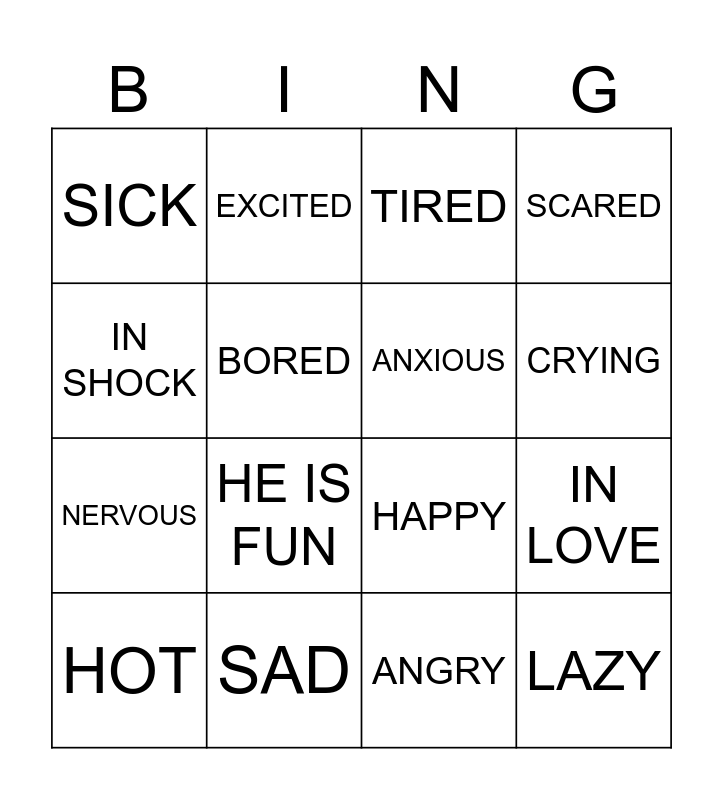 This bingo card has 16 words: SAD, IN LOVE, TIRED, SICK, NERVOUS, EXCITED, HAPPY, ANGRY, IN SHOCK, BORED, HOT, SCARED, HE IS FUN, CRYING, ANXIOUS and LAZY.