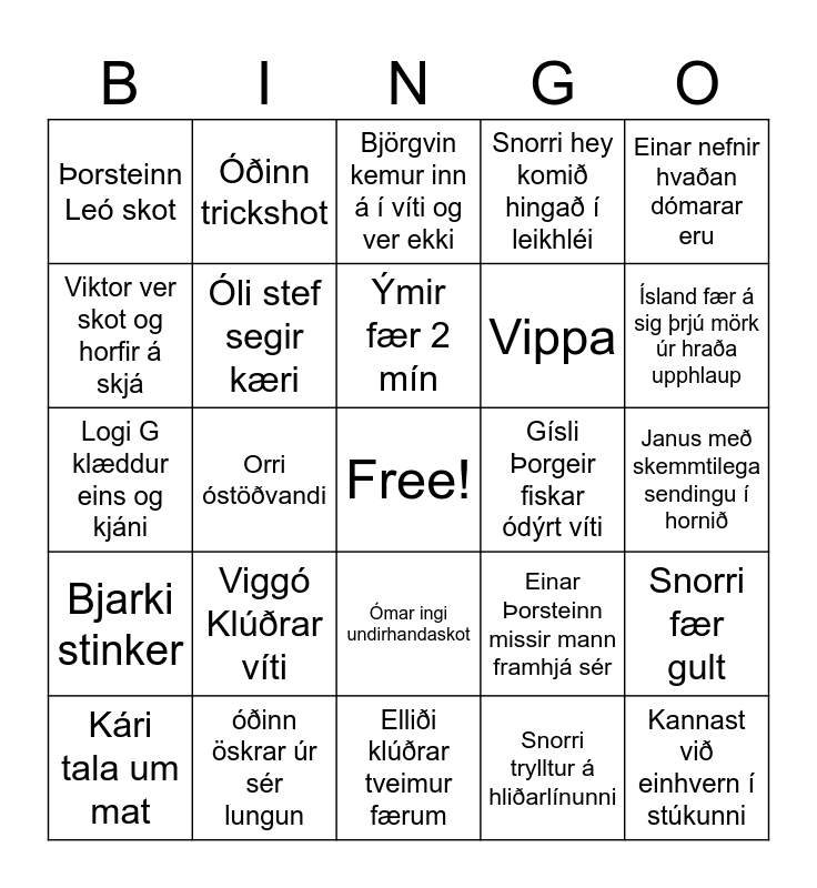 This bingo card has a free space and 24 words: Kári tala um mat, Viggó Klúðrar víti, Ýmir fær 2 mín, Snorri trylltur á hliðarlínunni, Einar nefnir hvaðan dómarar eru, Þorsteinn Leó skot, Óðinn trickshot, Björgvin kemur inn á í víti og ver ekki, Gísli Þorgeir fiskar ódýrt víti, Janus með skemmtilega sendingu í hornið, Logi G klæddur eins og kjáni, Óli stef segir kæri, Einar Þorsteinn missir mann framhjá sér, Snorri fær gult, Viktor ver skot og horfir á skjá, óðinn öskrar úr sér lungun, Elliði klúðrar tveimur færum, Snorri hey komið hingað í leikhléi, Ísland fær á sig þrjú mörk úr hraða upphlaup, Bjarki stinker, Orri óstöðvandi, Ómar ingi undirhandaskot, Vippa and Kannast við einhvern í stúkunni.