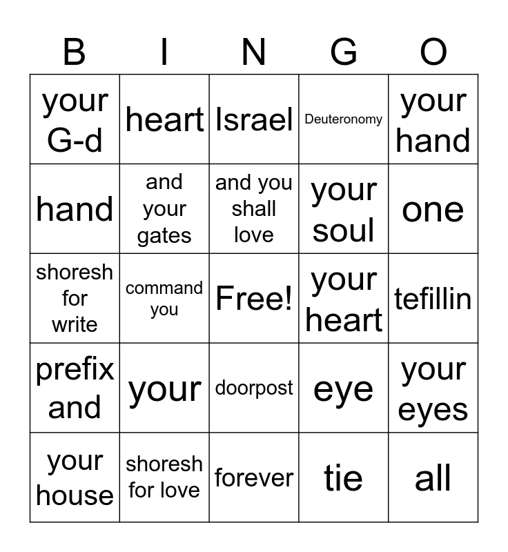 This bingo card has a free space and 24 words: your, shoresh for love, and you shall love, your house, your hand, your G-d, hand, heart, your heart, doorpost, your soul, shoresh for write, eye, your eyes, and your gates, tie, tefillin, Israel, one, command you, all, prefix and, Deuteronomy and forever.