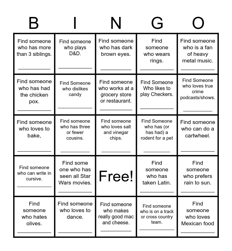 This bingo card has 35 words: Find Someone Who was born in June ____________, Find Someone who plays harmonica. ___________, Find someone who is double jointed. ___________, Find Someone Who likes to play Checkers. ____________, Find someone who loves Mexican food ___________, Find someone who has more than 3 siblings. ___________, Find Someone who dislikes candy _____________, Find Someone who was born in Brattleboro. ___________, Find Someone who has (or has had) a rodent for a pet __________, Find someone who plays hockey, soccer or lacrosse. ___________, Find someone who loves to bake, ___________, Find someone who plays D&D. ____________, Free!, Find someone who loves spicy food. __________, Find someone who is a fan of heavy metal music. ___________, Find someone who can write in cursive. _____________, Find someone who loves to dance. ___________, Find someone who has dark brown eyes. __________, Find someone who is on a track or cross country team. ______________, Find someone who can do a cartwheel. ___________, Find someone who hates olives. ___________, Find someone who has three or fewer cousins. ___________, Find someone who loves salt and vinegar chips. ___________, Find someone who wanted to (or wants to) be a Disney princess when they grow up. _____________, Find Someone who loves true crime podcasts/shows. ___________, Find someone who has had the chicken pox. ___________, Find someone who like black licorice. ___________, Find someone who makes really good mac and cheese. ___________, Find someone who has taken Latin. ___________, Find someone who prefers rain to sun. ___________, Find someone who wears mascara. ___________, Find some one who has seen all Star Wars movies. ___________, Find someone who works at a grocery store or restaurant. ___________, Find someone who wears rings. ___________ and Find someone who considers themselves outgoing. ___________.