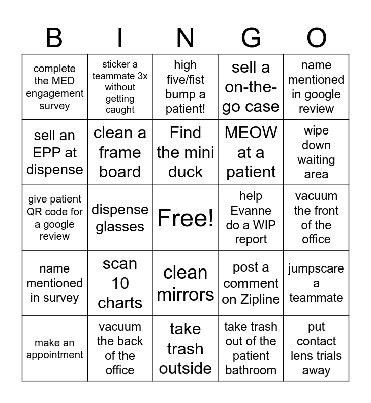 This bingo card has a free space and 29 words: make an appointment, adjust a patients frame, dispense glasses, dispense contacts, complete the MED engagement survey, high five/fist bump a patient!, clean a frame board, scan 10 charts, help Evanne do a WIP report, vacuum the back of the office, vacuum the front of the office, put contact lens trials away, take trash outside, take trash out of the patient bathroom, wipe down waiting area, fill MAS board, clean mirrors, name mentioned in survey, name mentioned in google review, give patient QR code for a google review, post a comment on Zipline, assign someone a task in Zipline, MEOW at a patient, sell an EPP at dispense, sell a on-the-go case, sticker a teammate 3x without getting caught, jumpscare a teammate, Find the mini duck and 5 second dance.