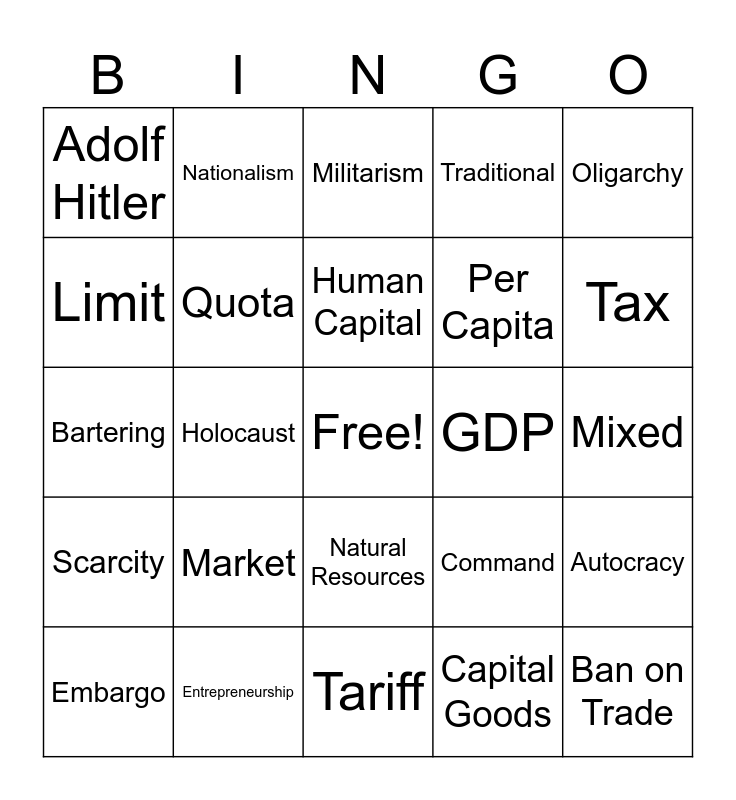 This bingo card has a free space and 24 words: Market, Entrepreneurship, Human Capital, Embargo, Oligarchy, Adolf Hitler, Limit, Nationalism, GDP, Natural Resources, Per Capita, Bartering, Command, Autocracy, Quota, Capital Goods, Mixed, Militarism, Tax, Holocaust, Ban on Trade, Scarcity, Traditional and Tariff.