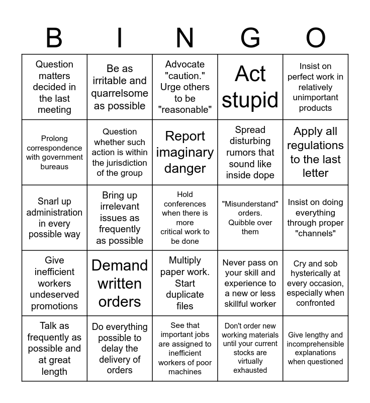 This bingo card has a free space and 29 words: Talk as frequently as possible and at great length, Refer all matters to committees, Bring up irrelevant issues as frequently as possible, Haggle over precise wordings, Question matters decided in the last meeting, Advocate "caution." Urge others to be "reasonable", Question whether such action is within the jurisdiction of the group, Demand written orders, "Misunderstand" orders. Quibble over them, Do everything possible to delay the delivery of orders, Insist on doing everything through proper "channels", Give lengthy and incomprehensible explanations when questioned, See that important jobs are assigned to inefficient workers of poor machines, Don't order new working materials until your current stocks are virtually exhausted, Apply all regulations to the last letter, Multiply procedures. See that three people have to approve everything where one would do, Multiply paper work. Start duplicate files, Give inefficient workers undeserved promotions, Insist on perfect work in relatively unimportant products, Snarl up administration in every possible way, Never pass on your skill and experience to a new or less skillful worker, Contrive as many interruptions to your work as you can, Spread disturbing rumors that sound like inside dope, Prolong correspondence with government bureaus, Act stupid, Be as irritable and quarrelsome as possible, Cry and sob hysterically at every occasion, especially when confronted, Report imaginary danger and Organize a group for presenting employee problems to the management.