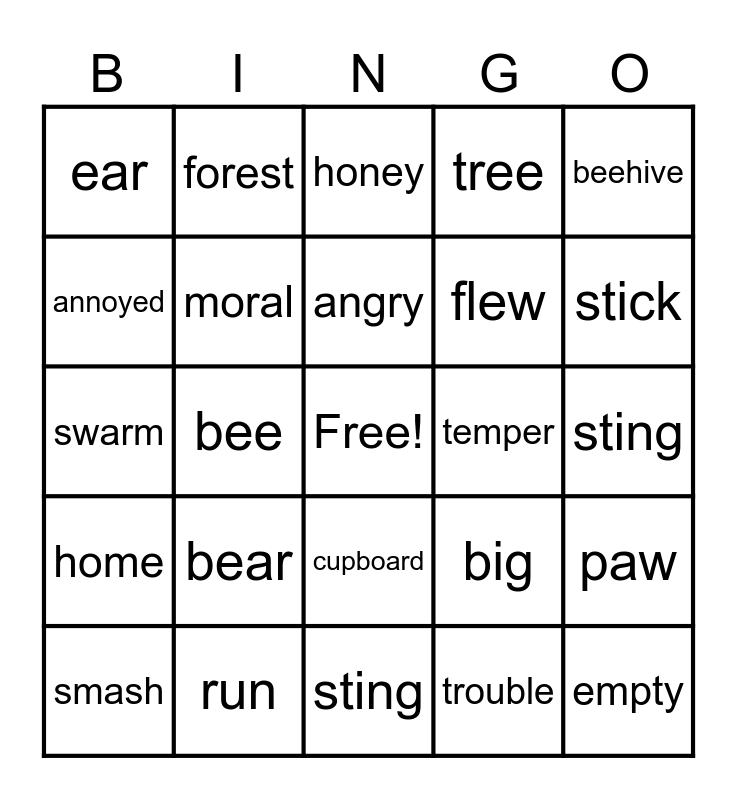 This bingo card has a free space and 24 words: bear, run, angry, smash, beehive, ear, annoyed, forest, temper, cupboard, flew, swarm, big, paw, moral, trouble, sting, honey, stick, bee, empty, home, tree and sting.