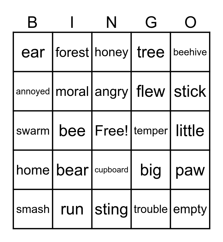 This bingo card has a free space and 24 words: bear, run, angry, smash, beehive, ear, annoyed, forest, temper, cupboard, flew, swarm, big, paw, moral, trouble, little, honey, stick, bee, empty, home, tree and sting.