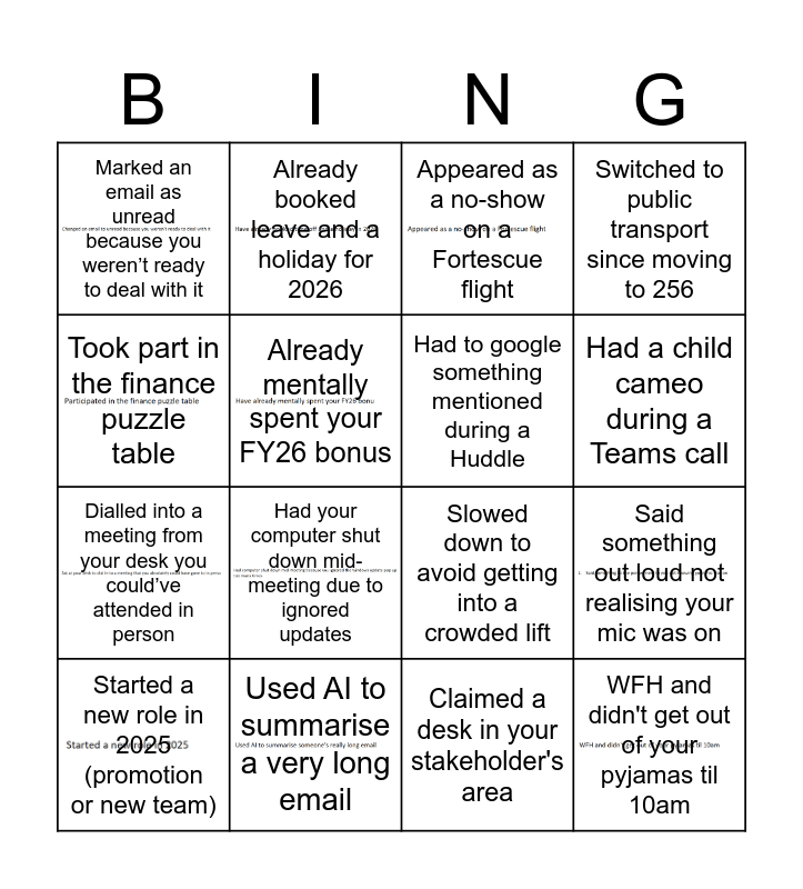 This bingo card has 13 images and 20 words: Said something out loud not realising your mic was on, Muted yourself to shout at a child, pet, partner, or roommate, Appeared as a no-show on a Fortescue flight, Used all of your annual leave in 2025, Started a new role in 2025 (promotion or new team), Took part in the finance puzzle table, Used AI to summarise a very long email, Marked an email as unread because you weren’t ready to deal with it, Dialled into a meeting from your desk you could’ve attended in person, Already booked leave and a holiday for 2026, Had your computer shut down mid-meeting due to ignored updates, Slowed down to avoid getting into a crowded lift, Already mentally spent your FY26 bonus, WFH and didn't get out of your pyjamas til 10am, Had to google something mentioned during a Huddle, Went to a class at the Wellness Centre, Had a child cameo during a Teams call, Switched to public transport since moving to 256, Claimed a desk in your stakeholder's area and Went to one of the Christmas Parties.