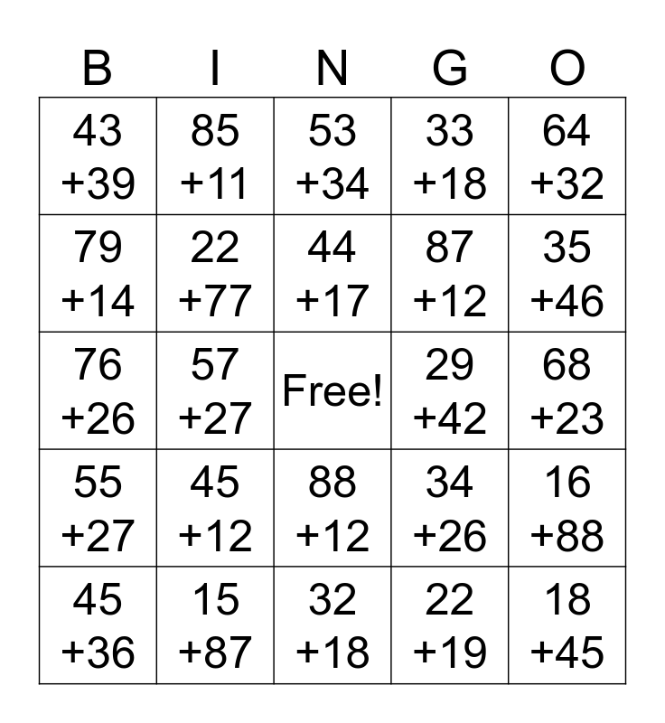 This bingo card has a free space and 29 words: 45 +36, 82 +13, 57 +27, 55 +34, 43 +39, 53 +34, 22 +77, 45 +12, 29 +42, 15 +87, 68 +23, 18 +45, 32 +18, 22 +19, 35 +46, 75 +14, 88 +12, 55 +27, 64 +32, 76 +26, 34 +26, 15 +32, 87 +12, 79 +14, 33 +18, 85 +11, 16 +88, 44 +17 and 55 +17.