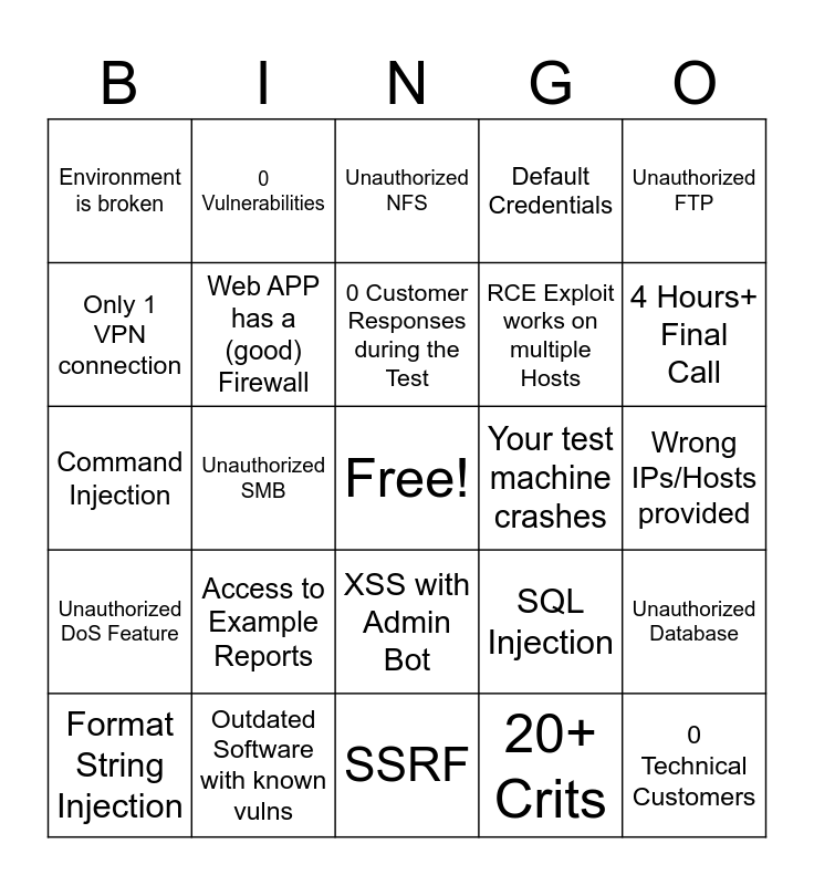 This bingo card has a free space and 24 words: Access to Example Reports, Outdated Software with known vulns, 0 Customer Responses during the Test, Format String Injection, Unauthorized FTP, Environment is broken, Only 1 VPN connection, 0 Vulnerabilities, Your test machine crashes, XSS with Admin Bot, RCE Exploit works on multiple Hosts, Command Injection, SQL Injection, Unauthorized Database, Web APP has a (good) Firewall, 20+ Crits, Wrong IPs/Hosts provided, Unauthorized NFS, 4 Hours+ Final Call, Unauthorized SMB, 0 Technical Customers, Unauthorized DoS Feature, Default Credentials and SSRF.