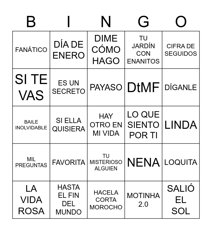 This bingo card has 25 words: FAVORITA, HACELA CORTA MOROCHO, PAYASO, LA VIDA ROSA, CIFRA DE SEGUIDOS, FANÁTICO, SI TE VAS, DÍA DE ENERO, LO QUE SIENTO POR TI, TU MISTERIOSO ALGUIEN, DtMF, BAILE INOLVIDABLE, NENA, LOQUITA, ES UN SECRETO, SALIÓ EL SOL, LINDA, DIME CÓMO HAGO, DÍGANLE, SI ELLA QUISIERA, HAY OTRO EN MI VIDA, HASTA EL FIN DEL MUNDO, MIL PREGUNTAS, TU JARDÍN CON ENANITOS and MOTINHA 2.0.