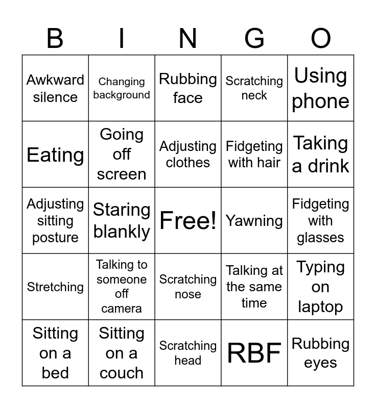 This bingo card has a free space and 24 words: Talking to someone off camera, Sitting on a couch, Adjusting clothes, Sitting on a bed, Using phone, Awkward silence, Eating, Changing background, Yawning, Scratching nose, Fidgeting with hair, Adjusting sitting posture, Talking at the same time, Typing on laptop, Going off screen, RBF, Fidgeting with glasses, Rubbing face, Taking a drink, Staring blankly, Rubbing eyes, Stretching, Scratching neck and Scratching head.
