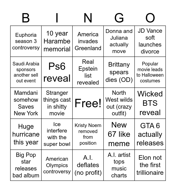 This bingo card has a free space and 24 words: Ice interfere with the super bowl, American Olympics controversy, Real Epstein list revealed, Big Pop star releases bad album, JD Vance soft launches divorce, Euphoria season 3 controversy, Saudi Arabia sponsors another sell out event, 10 year Harambe memorial, North West wilds out (crazy outfit), Kristy Noem removed from position, Brittany spears dies (OD), Mamdani somehow Saves New York, New 67 like meme, GTA 6 actually releases, Ps6 reveal, A.I. artist tops music charts, Wicked BTS reveal, America invades Greenland, Popular movie leads to Halloween costumes, Stranger things cast in shitty movie, Elon not the first trillionaire, Huge hurricane this year, Donna and Juliana actually move and A.I. deflates (no profit).