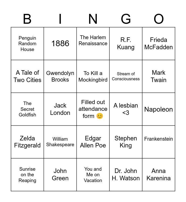 This bingo card has a free space and 24 words: William Shakespeare, John Green, To Kill a Mockingbird, Sunrise on the Reaping, Frieda McFadden, Penguin Random House, A Tale of Two Cities, 1886, A lesbian <3, Edgar Allen Poe, Stream of Consciousness, The Secret Goldfish, Stephen King, Frankenstein, Gwendolyn Brooks, Dr. John H. Watson, Napoleon, The Harlem Renaissance, Mark Twain, Jack London, Anna Karenina, Zelda Fitzgerald, R.F. Kuang and You and Me on Vacation.